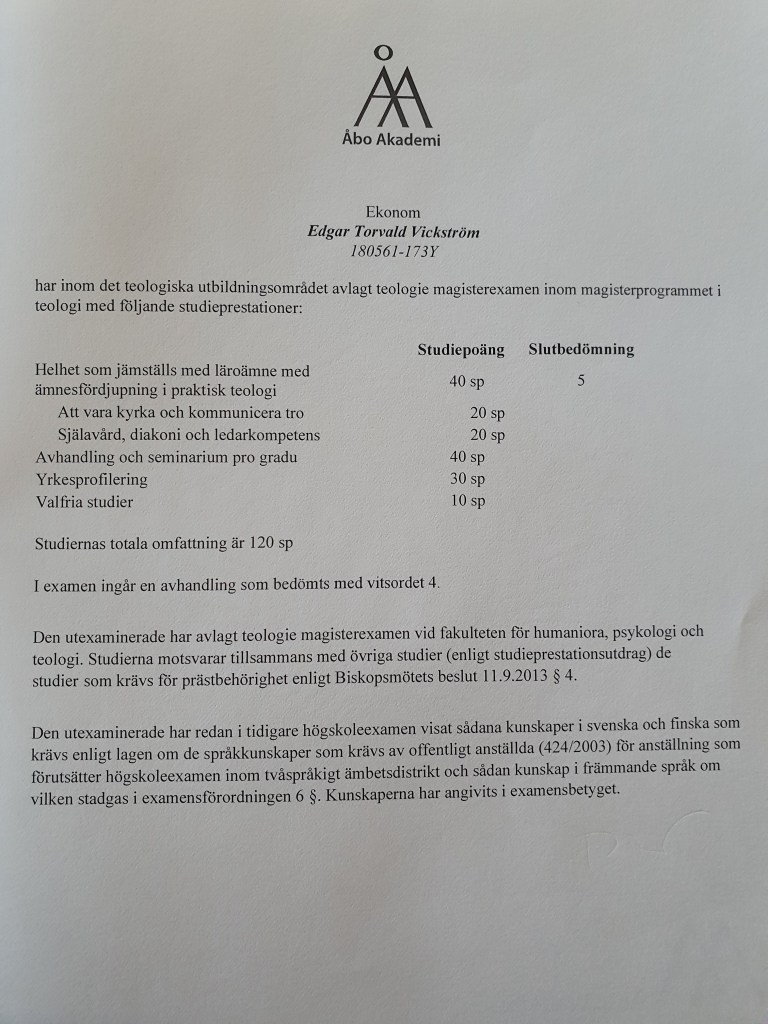…från Åbo Akademi. Jag är uppriktigt lycklig över de möjligheter jag fått i livet, och tycker att det här betyget med skrivningen ”Ekonom Edgar…har…avlagt teologie magisterexamen…” är en symbol för att ingenting är omöjligt – för någon. Om man helhjärtat följer sin kallelse [och den måste inte alls ha med religion att göra] så kan man åstadkomma nästan vad som helst. Nu är det ju inte så att jag ännu har åstadkommit något i egentlig mening, utan snarare har jag skaffat mig en utbildning som ger mig rätten att få en formell position som jag i bästa fall kan använda för att uträtta något…, men i alla fall.